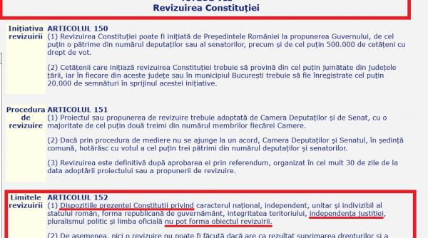 Nici USR, nici Ciprian Ciucu, reprezentanții Coaliției care marșează pe acest referendum, dar nici restul factorilor de decizie care ar putea avea în vedere un astfel de obiectiv, nu vor putea înlătura efectele articolului 152 din Constituția României, care reglementează limitele revizuirii Constituției. Conform acestui articol, „dispozițiile prezentei Constituții privind (…) independența justiției (…) nu pot face obiectul revizuirii”. Mai mult, „de asemenea, nicio revizuire nu poate fi făcută dacă are ca rezultat suprimarea drepturilor și a libertăților fundamentale ale cetățenilor sau a garanțiilor acestora”.